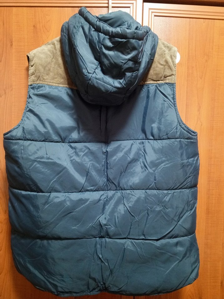 Fermuarlı ve kapüşonlu yelek. Yumuşak ve sıcak kumaştan, kahverengi ve lacivert,üst kusmı fitilli kadife. Çocuk olarak geçiyor fakat S ve M bedene de uyar.