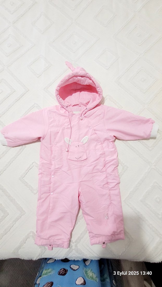 Kapüşonlu ve fermuarlı, önünde küçük hayvan figürlü pastel pembe bebek tulumu. Yumuşak ve sıcak kumaştan üretilmiştir. ❄️ kışlık kalın astronot 2 yaşa kadar olur
