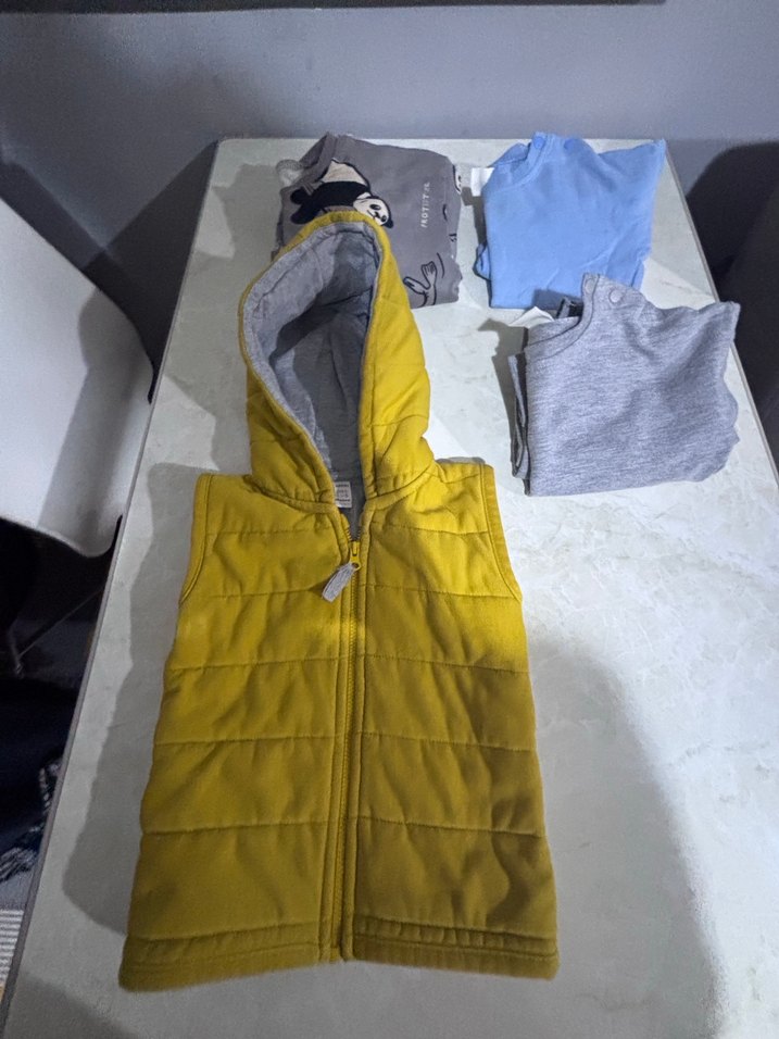 Kapüşonlu ve fermuarlı, sarı renkte, yumuşak ve sıcak kumaştan üretilmiş kolsuz yelek. Gri iç astarlı, trend sokak tarzına uygun dar kesim.