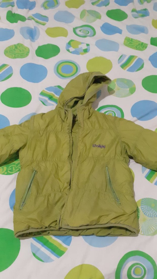 Yumuşak ve sıcak kumaştan, kapüşonlu ve fermuarlı ceplerle tasarlanmış, bol kesim yeşil erkek çocuk mont.