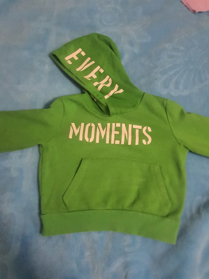 Yeşil kapüşonlu erkek çocuk sweatshirt, uzun kollu ve bol kesimdir. Önünde "MOMENTS", kapüşonunda "EVERY" renkli baskılar vardır. Yumuşak ve sıcak kumaştan üretilmiştir.