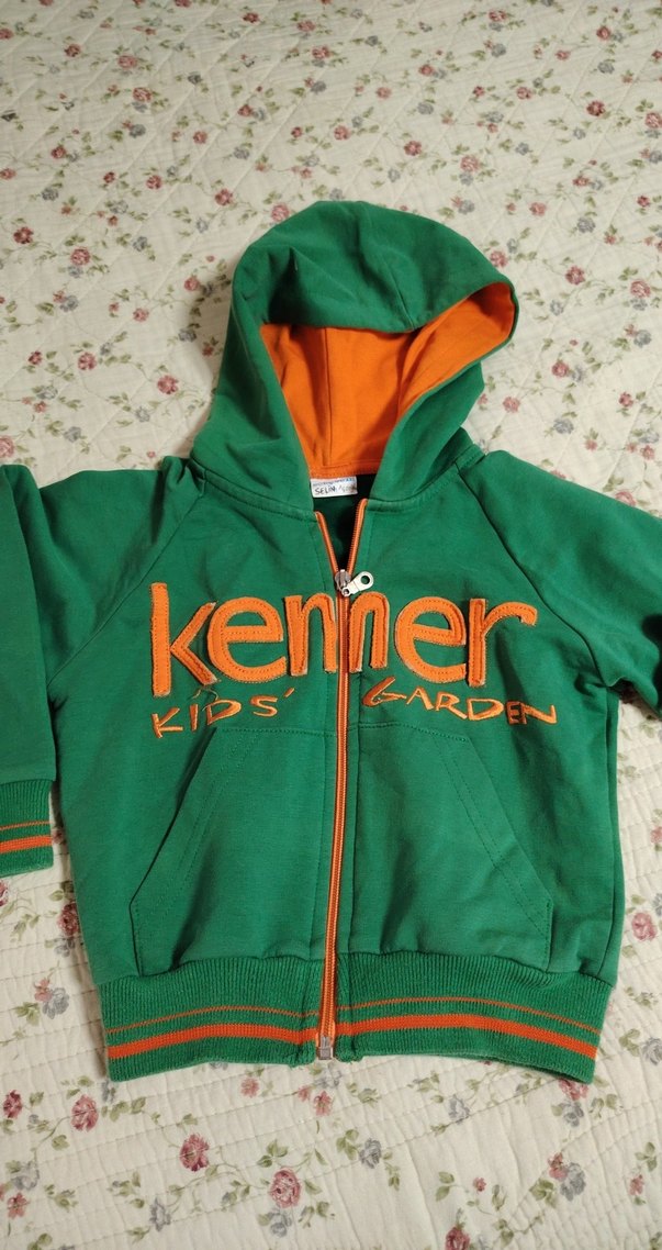 Renkli baskılı, yeşil kapüşonlu ve fermuarlı, uzun kollu, yumuşak ve sıcak kumaştan erkek çocuk sweatshirtü. Önünde 'kenner KIDS ARDEN' yazısı bulunur.