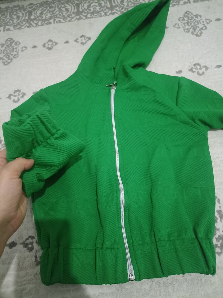 Kapüşonlu, fermuarlı ve uzun kollu yeşil kadın ceketi, yumuşak ve sıcak kumaştan, günlük kullanım için uygun, orta boy kesim.