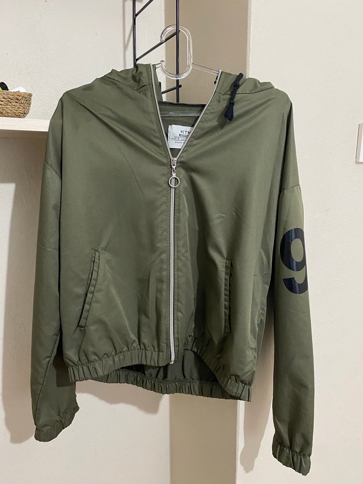Kapüşonlu, fermuarlı, uzun kollu yeşil ceket. Baskılı detaylar ve rahat sentetik kumaş, gündelik kullanım için uygundur.