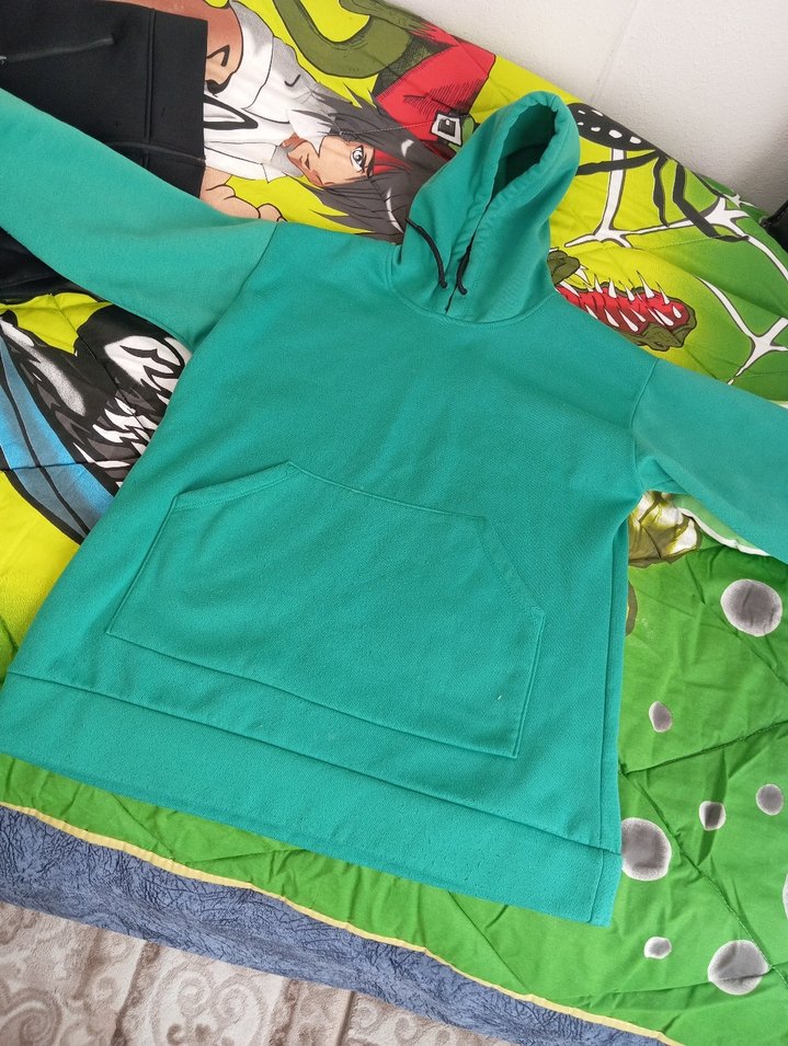 Yeşil kapüşonlu sweatshirt, uzun kollu ve bol kesimdir. Önünde cep ve fermuar detayı bulunur, midi boydadır. Sokak modası ve athleisure tarzına uygundur.