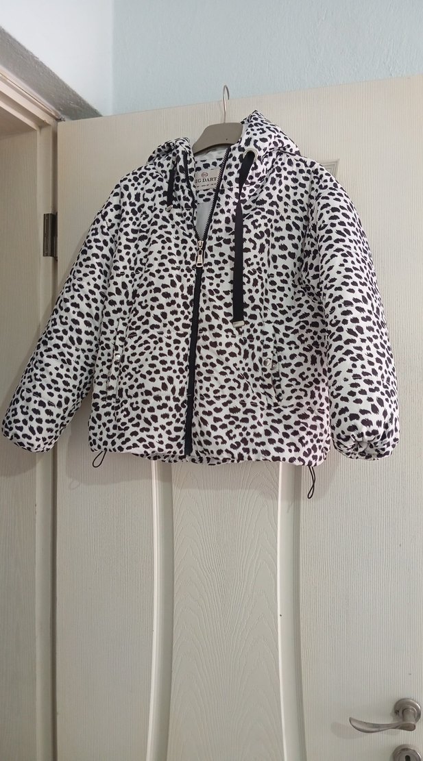 Kapüşonlu, uzun kollu ve bol kesim kadın kısa mont. Zebra desenli ve kürk detaylı, yumuşak ve sıcak kumaştan üretilmiştir. Beyaz ve gri tonlardadır.