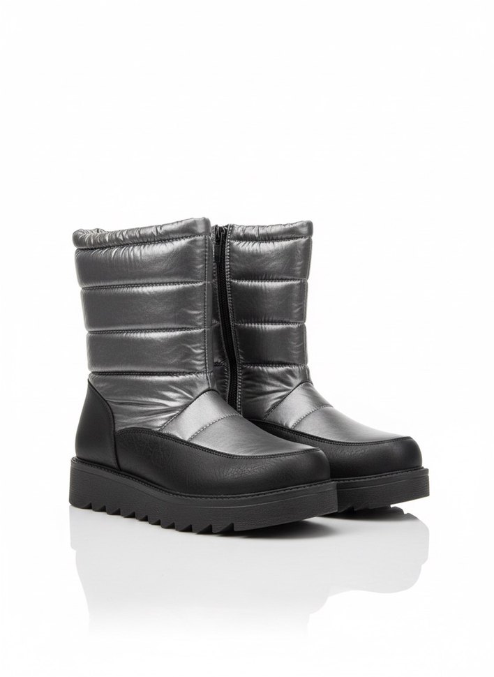 Gri renkli, dolgu topuklu ve ön fermuarlı kadın botları. Kauçuk malzemeden üretilmiş, günlük kullanıma uygun, rahat ve çağdaş tarzda.