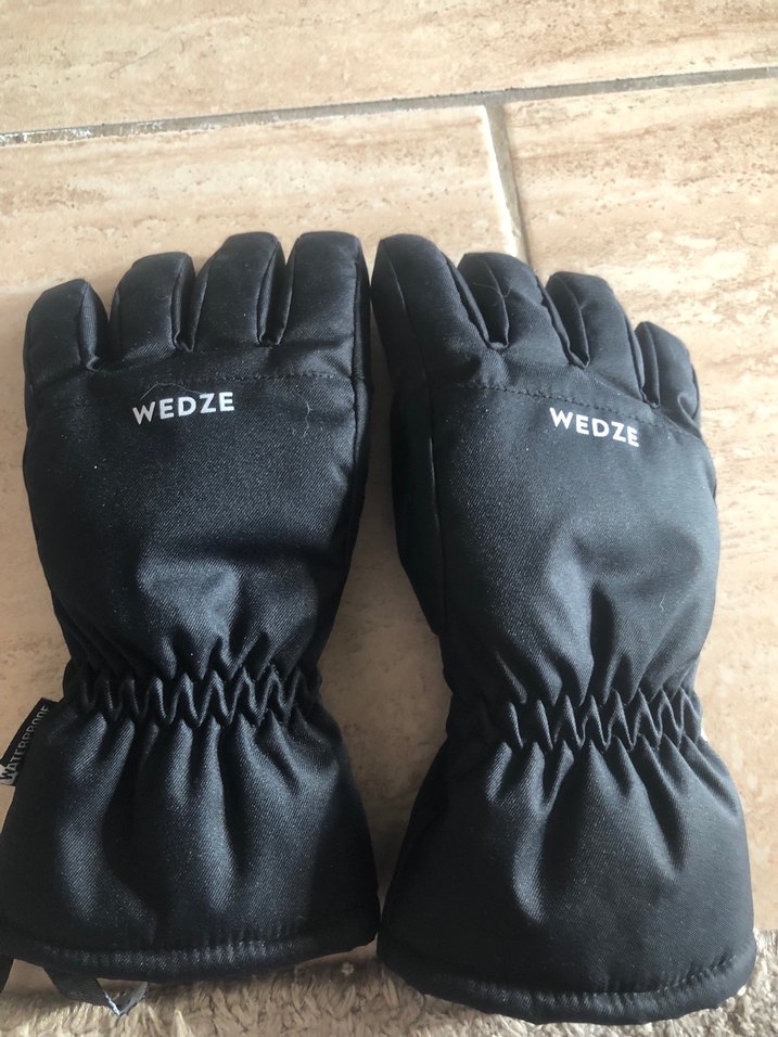 Erkek çocuklar için siyah biker tarzı, polar astarlı ve cırtcırtlı eldivenler. WEDZE logosu bulunur, sade ve temel tasarımda. İçi polarlı 4,6 yaş uyumlu