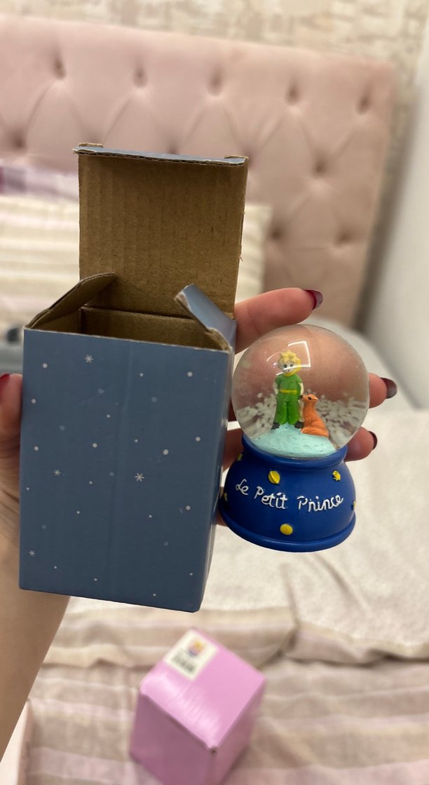 Mavi tabanlı, sarı yıldızlı ve beyaz kar taneli kubbe içinde Küçük Prens ve tilki figürlü kar küresi.