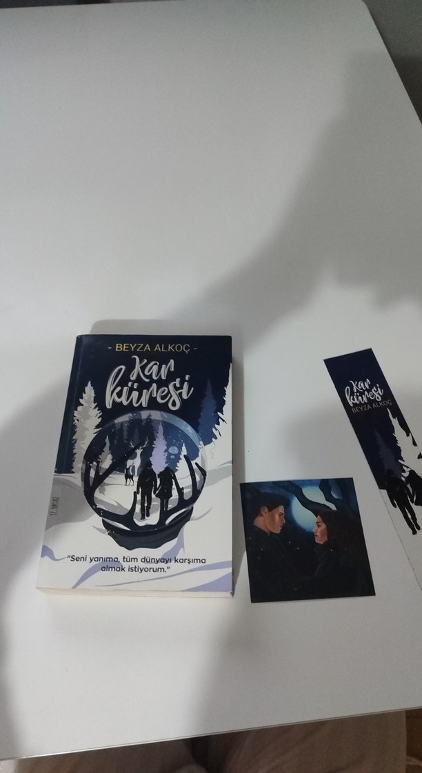 Beyza Alkoç'un 'Kar Küresi' adlı romanı, kış temalı kapak ve kar manzarası içerir. Kitapta ayraç ve iki kişinin konuştuğu küçük bir ilustrasyon yer alır. ❄️