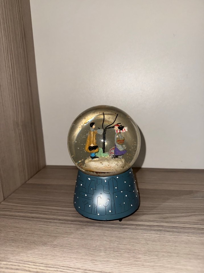 İçinde iki kişinin ağaç altında olduğu kar küresi, mavi taban üzerinde beyaz noktalarla süslenmiş. ❄️ Ürün seslidir. Altında bulunan düğmeye basıp çalan müzikle çok güzel bir yılbaşı akşamını renklendirebilirsiniz.❄️