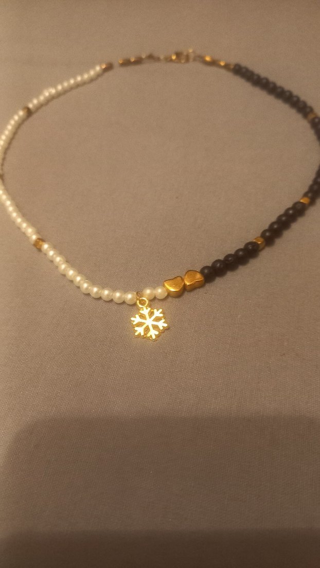 Kısa uzunlukta, boncuklu bu kolye altın renkli etnik kar tanesi kolye ucu ve koyu ile açık renk boncuklar içerir, bohem tarzını yansıtır. ❄️el yapımı dogal volkanik taş kullanılmıştır