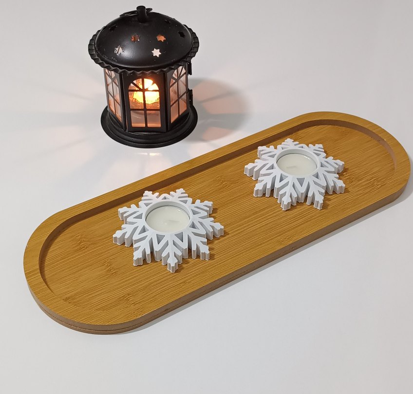 Ahşap tepsi üzerinde yer alan iki beyaz kar tanesi şeklinde tealight mumluk. ❄️ 3d Print Design Dekoratif Hediyelikler . İkili mumluk fiyatıdır. istenilen sayıda ilan açılır. #evyaşam#ev dekorasyonu#mum#mumluk#hediyelik#hobi