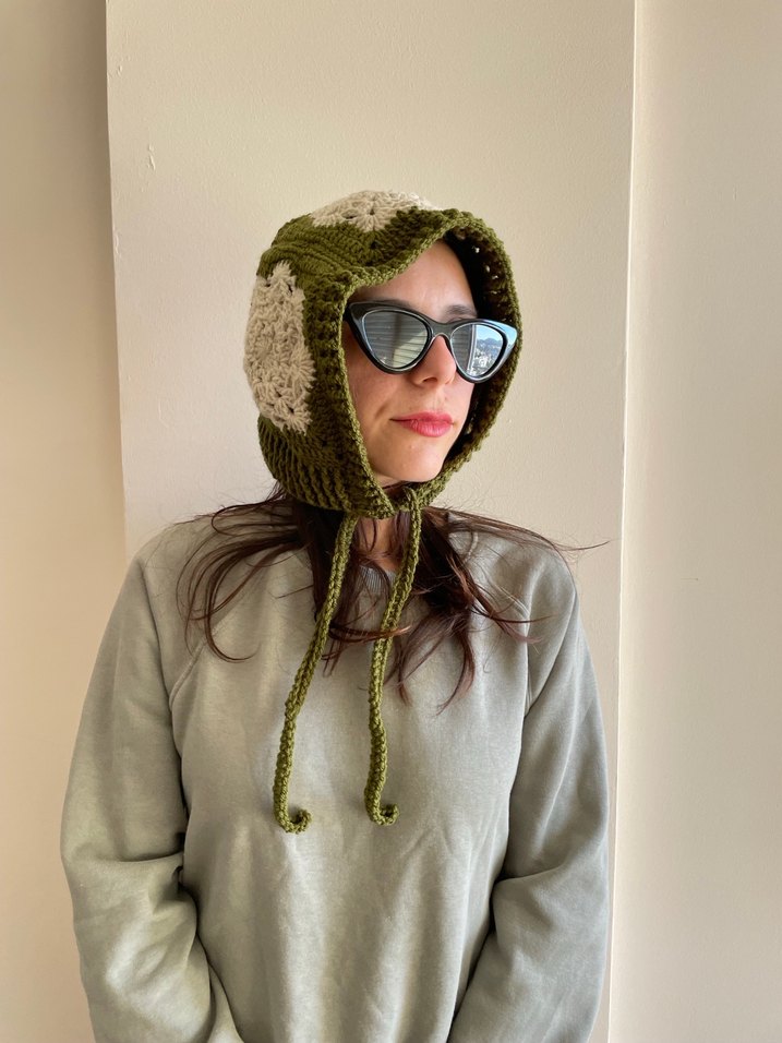Haki, örgü dokulu, bağcıklı kadın bere. Bohem ve retro tarzıyla dikkat çeker. Sıcak tutar ve rahat kullanılır.