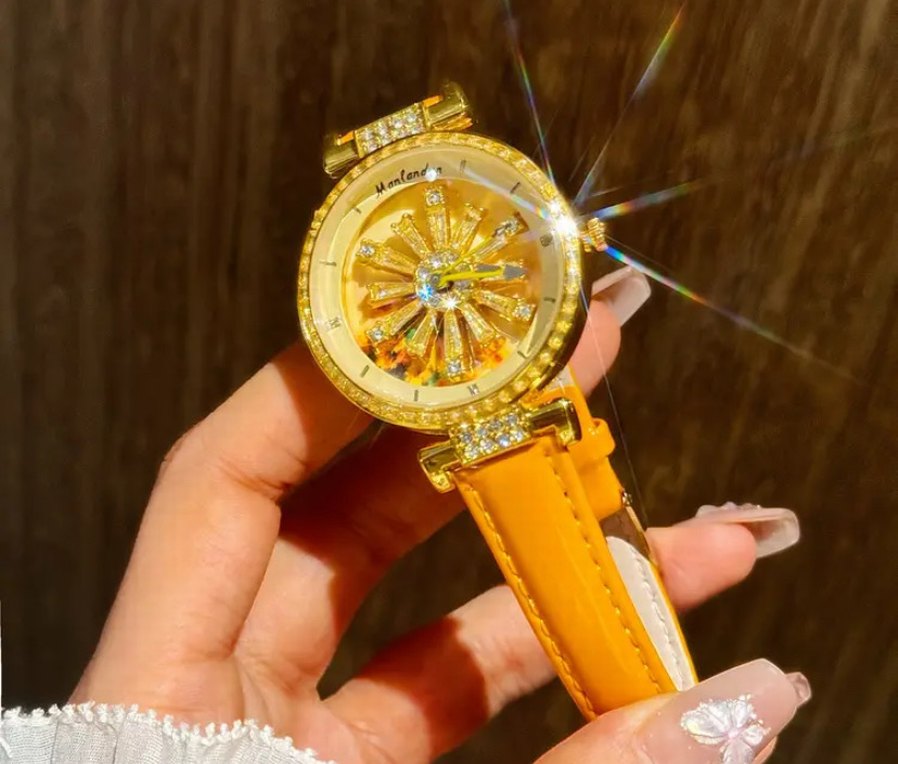 Renkli sarı deri kayışa ve tokalı kapamaya sahip, bohem tarzdan ilham alan ışıltılı kadranlı kadın kol saati. ✨ iç detayı dönmelidir.Ön sipariş için iletişime geçiniz. Ürün yurt dışından gelmektedir.