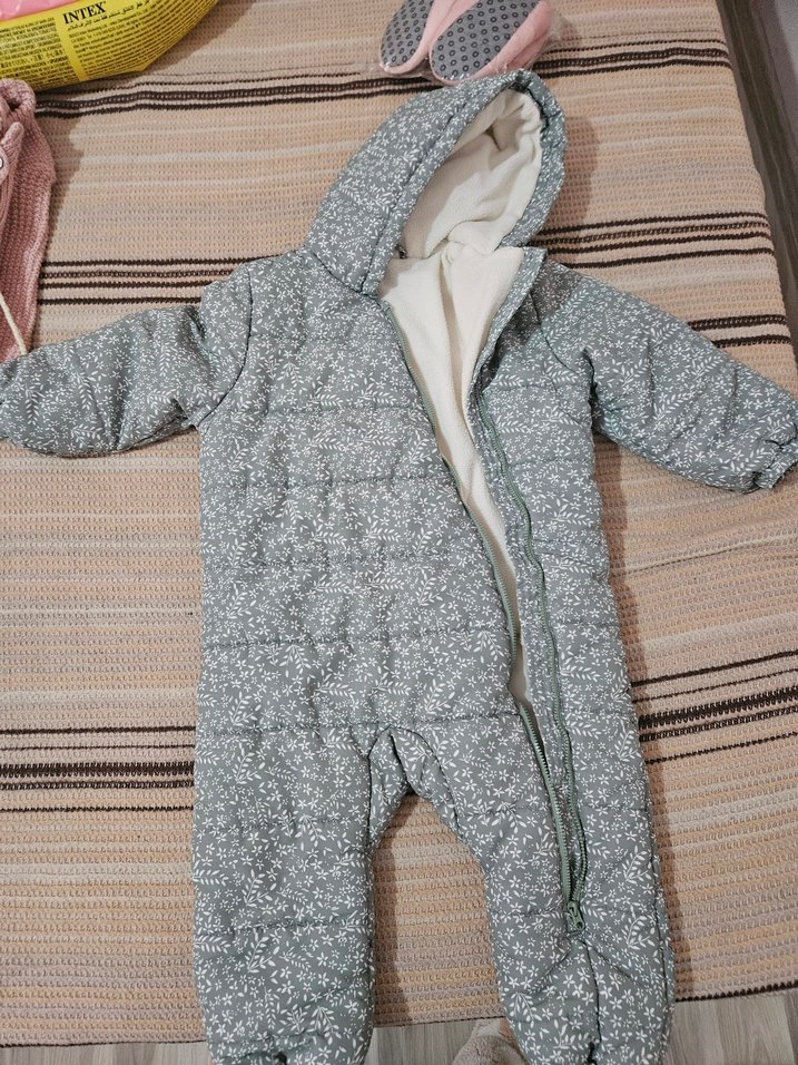 Gri renkli, fermuarlı ve kapüşonlu bebek kız tulumu. Yumuşak ve sıcak kumaştan, boğazlı yakalı ve ince çiçek desenli.