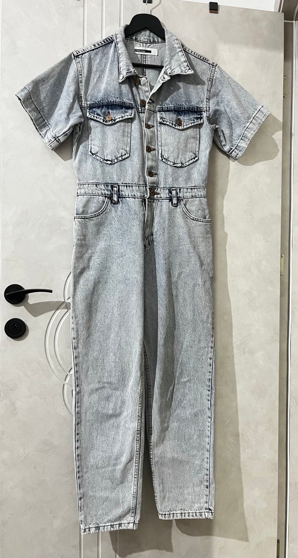 Kar yıkamalı jean denim kumaştan, düğmeli ve yakalı midi tulum. Kısa kollu, regular fit ve bağlama deseni ile gündelik sokak stiline uygun. M-L beden uyumludur. 2 kere giyildi herhangi bir defosu yoktur. Bana olmadığı için satıyorum.