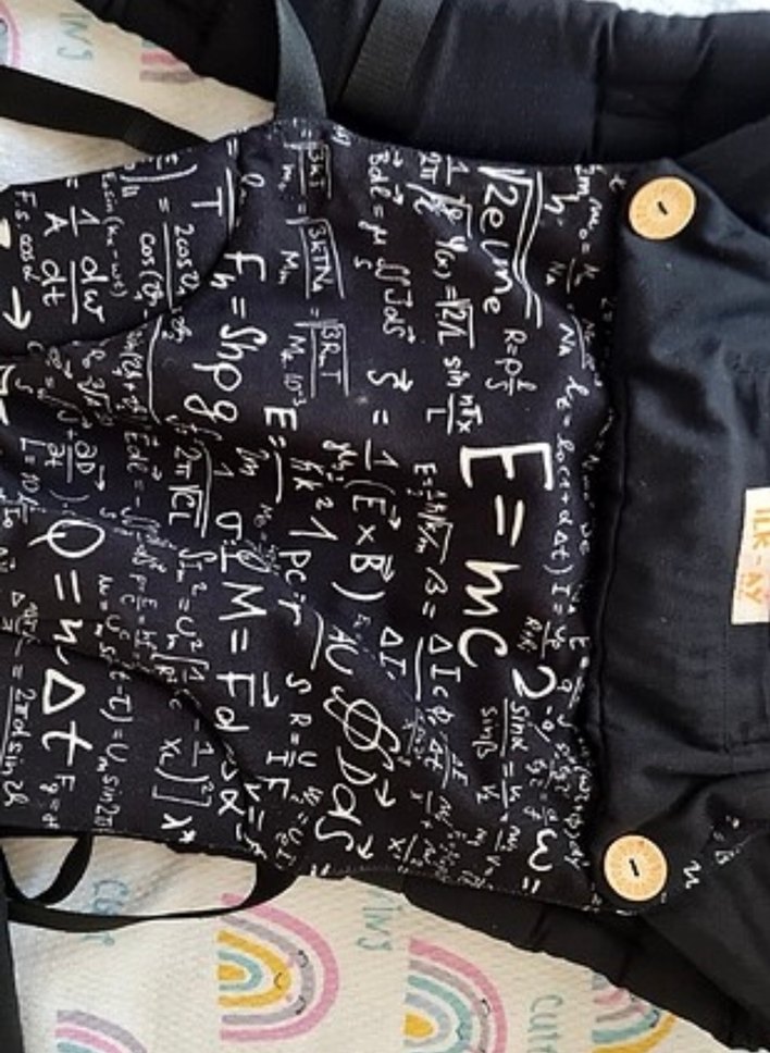 Bilimsel formüllerle desenlenmiş koyu siyah bebek taşıyıcı, fonksiyonel ve şık tasarıma sahip. Ahşap düğme detayları bulunur.