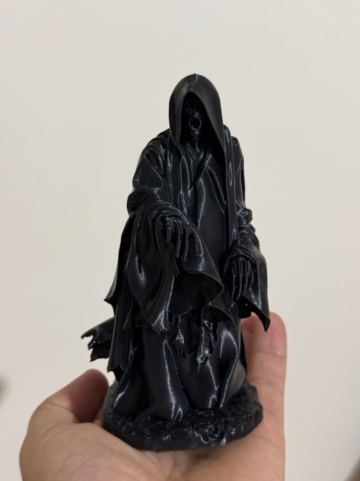 Kara, kapüşonlu ve pelerinli figür; iskelet el detayları ve dokulu taban ile tasarlandı.