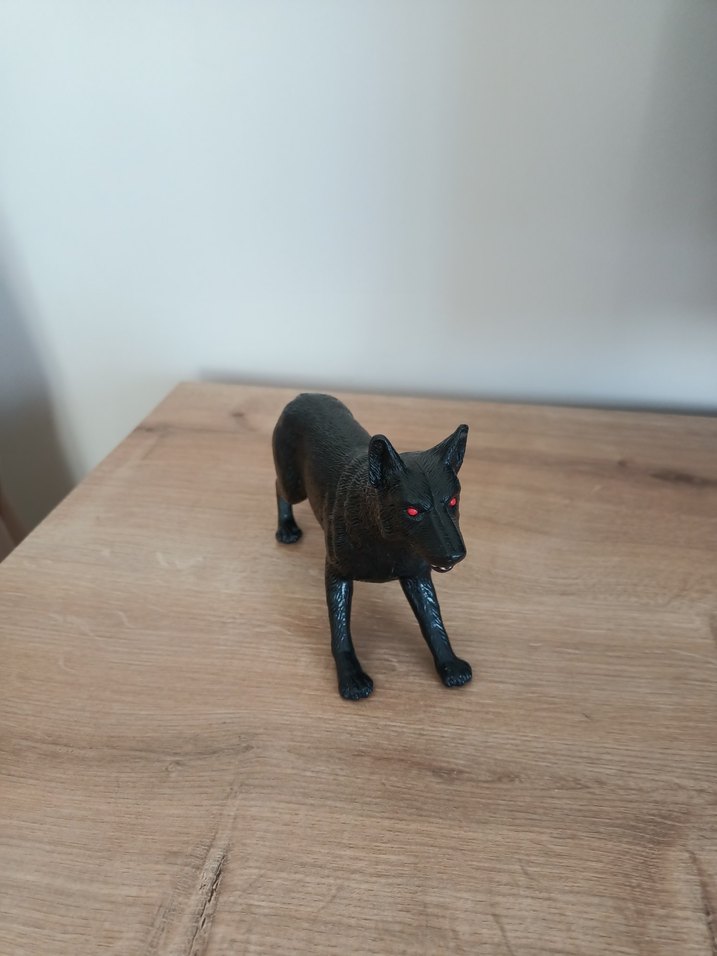 Kırmızı gözlere sahip koyu siyah kurt figürü, detaylı dokularla gerçekçi bir görünüme sahiptir.