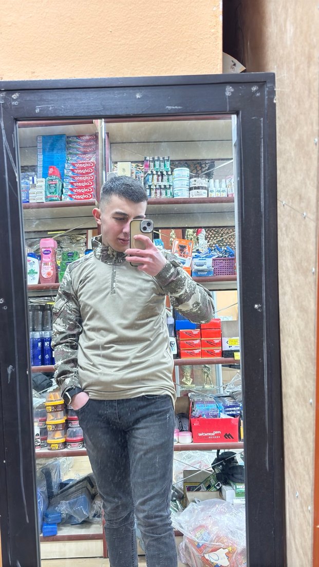 Gri kamuflaj desenli, uzun kollu, yüksek yakalı ve bol kesim erkek T-Shirt Günlük kullanıma uygun rahat tarzda.