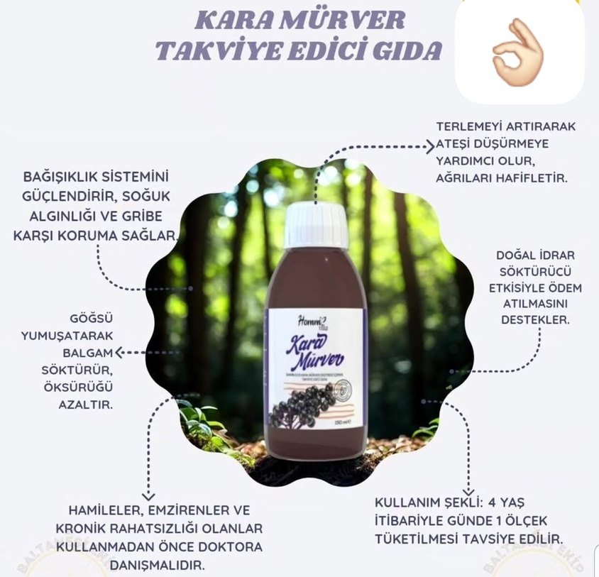 Kara mürver takviye edici gıda bağışıklık sistemini destekler, ateş ve ağrıları azaltmaya yardımcı olur, soğuk algınlığı ve gribe karşı destek sağlar. Kullanımdan önce doktora danışılmalıdır.