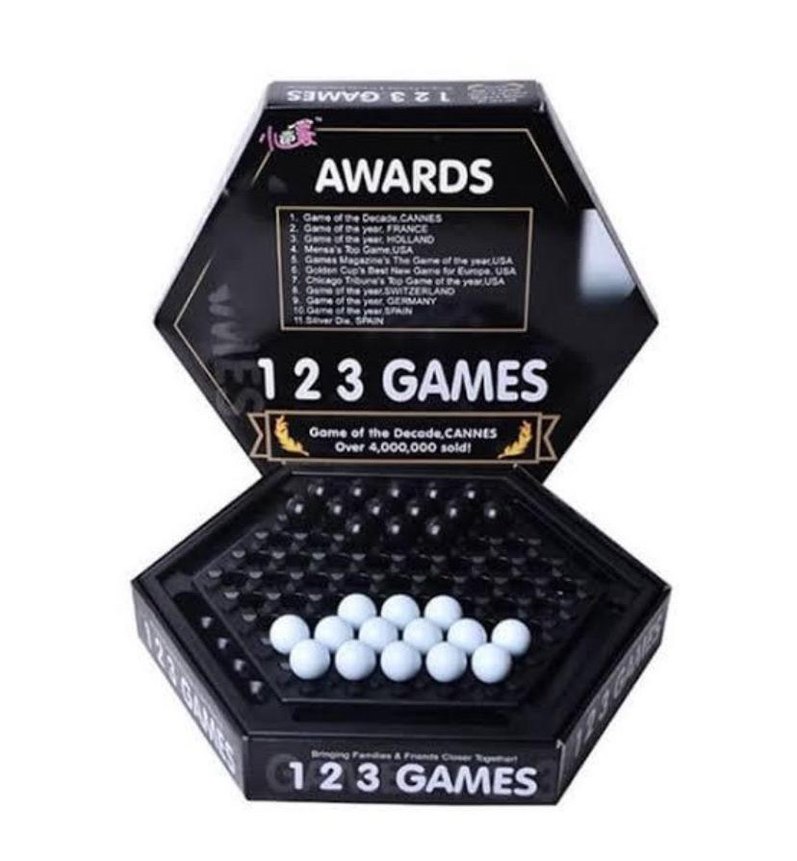 Siyah renkte, altıgen tasarımlı ve beyaz oyun taşlarına sahip 123 Games zeka oyunu. Stratejik düşünceyi geliştiren bir bulmaca.
