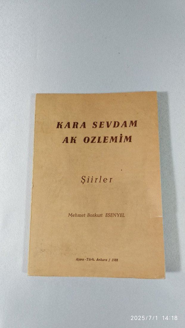 1988 yılında yayımlanan, Mehmet Bozkurt Esenyel'in şiirlerini içeren "Kara Sevdam Ak Özlemim" şiir kitabı.