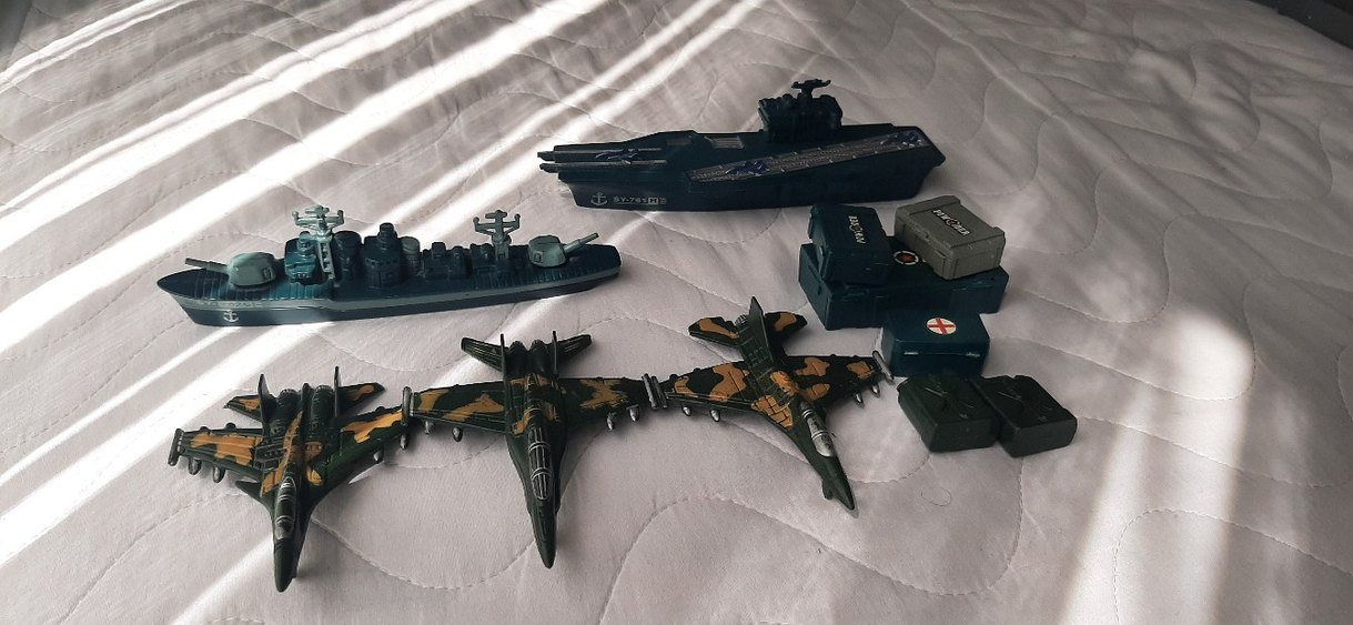 Kara ve Kamuflaj Renkli Model Uçak ve Gemi Seti fotolarda tümü