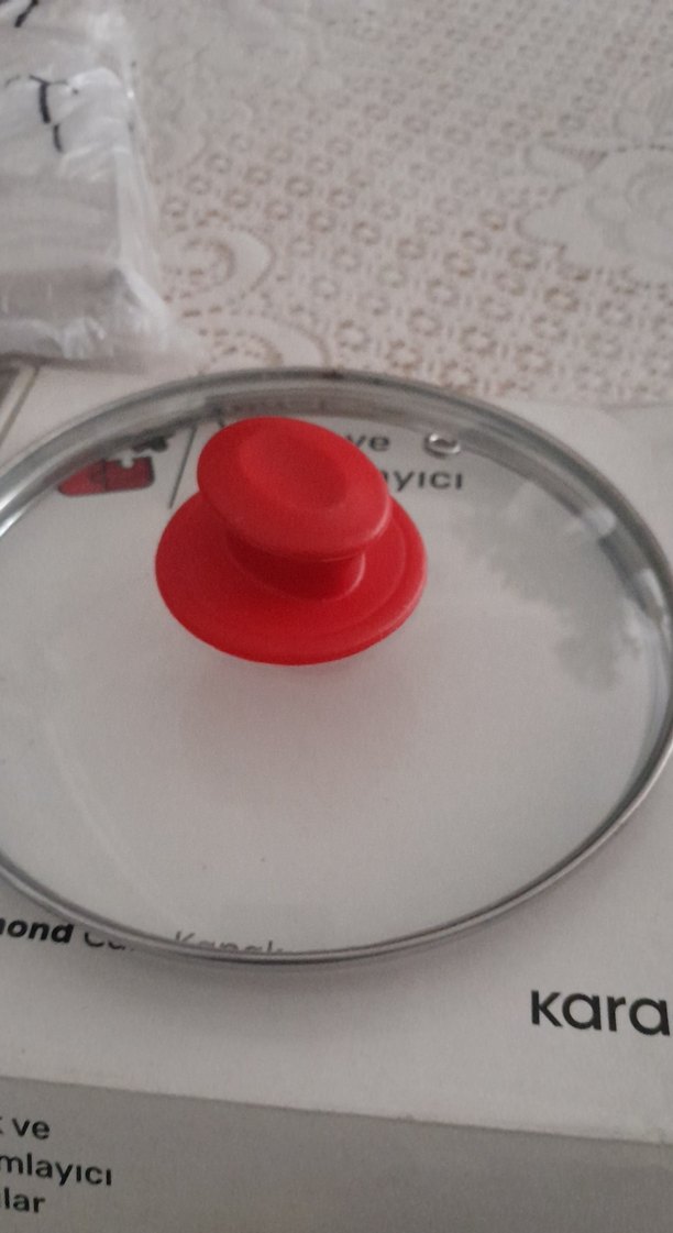 Kırmızı saplı, gri kenarlıklı cam tencere kapağı. Ambalajında 'kara' yazısı bulunmaktadır.