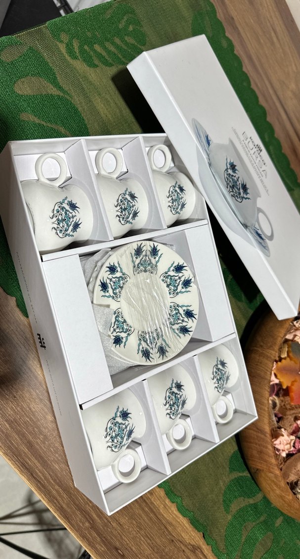 Karaca Mavi detaylı desenlere sahip, kutusunda 6 beyaz kahve fincanı ve tabağı seti. ☕ Bursa Özel Serisi