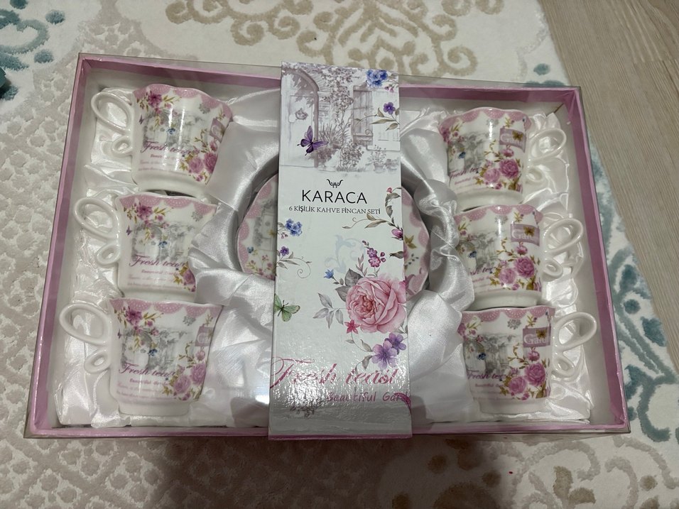 Karaca markasına ait, pastel renklerde çiçek desenli beyaz 6'lı kahve fincan seti. ☕ Hiç kullanılmadı yer açılması için satıyorum hiçbir kusuru yoktur