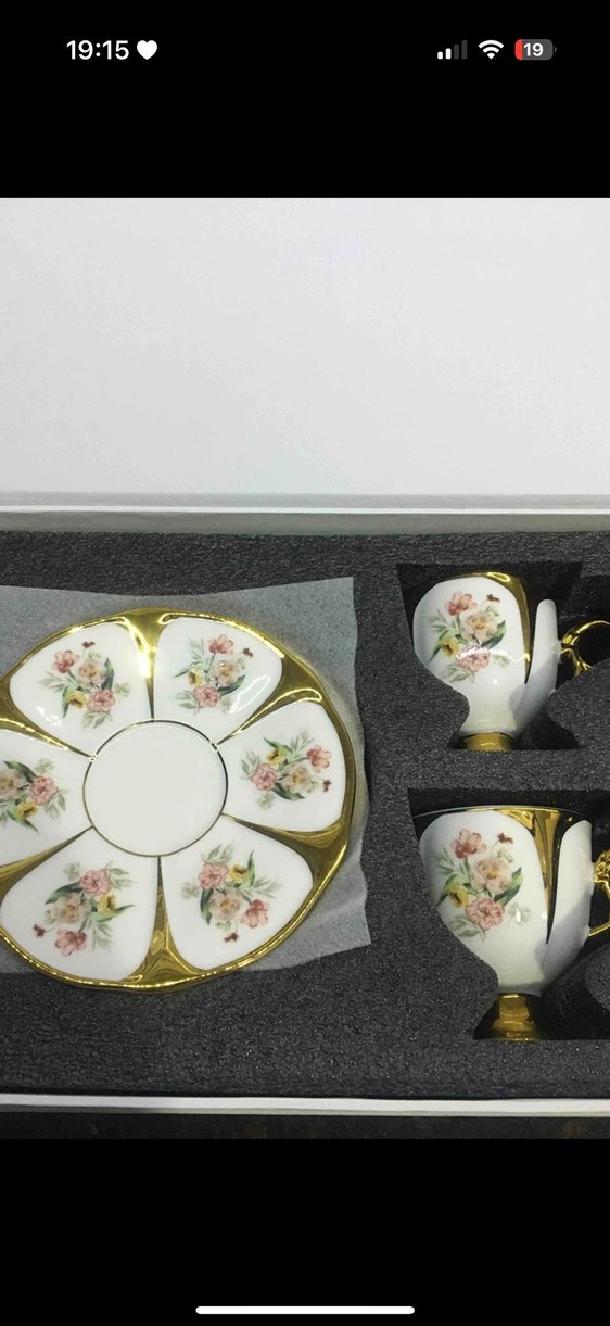 Altın detaylı çiçek desenli porselen iki fincan ve tabaktan oluşan set. Çay veya kahve sunumu için uygundur. ☕