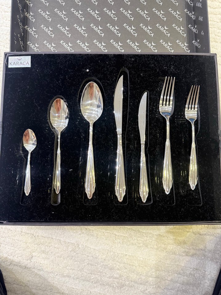Parlak yüzeye sahip Karaca 84 parça çatal, kaşık ve bıçak seti, çok şık bir ve kaliteli bir takım paketleri ile duruyor bir kaç çay kaşığı hariç kullanmadım çeyizim den