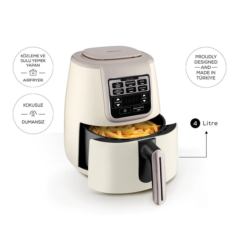 Krem dijital hava fritözü, kullanımı kolay kontrol paneli ve yağsız kızartma için geniş sepet sunar. Sağlıklı pişirme sağlar.