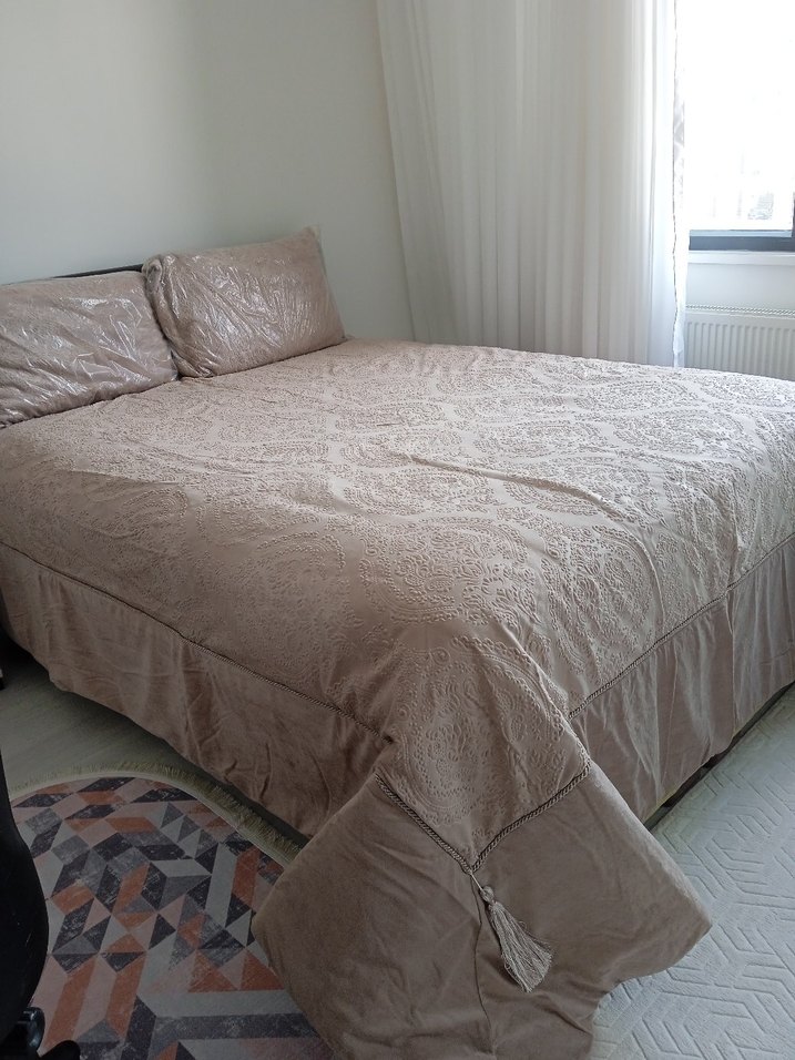 Yatak odasına yumuşaklık katan püskül detaylı, bej renkli düz yatak örtüsü. Hiç kullanılmadı karaca