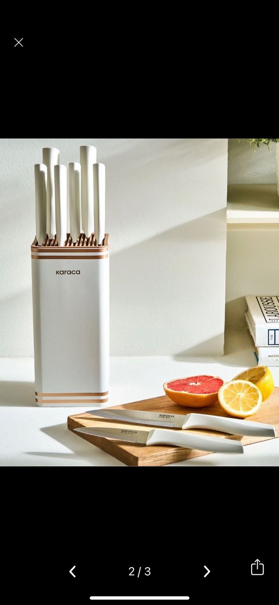 Karaca beyaz bıçak seti, şık standıyla birlikte, pürüzsüz saplar ve keskin bıçaklar içerir. Çoklu bıçaklar kompakt tutucuda. Kutusunda çok ufak lekesi vardır