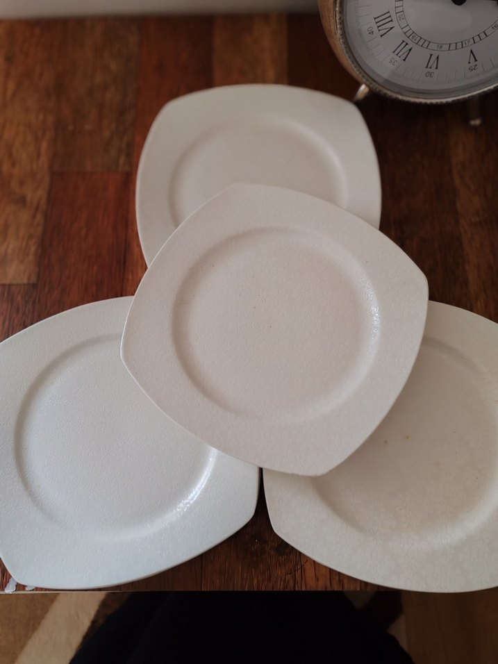 Karaca markalı beyaz ve gri renkte, pürüzsüz yüzeye sahip tabak seti. ️1-2 KEZ kullanıldı hiç bir sorunu yok dolapda duruyor
