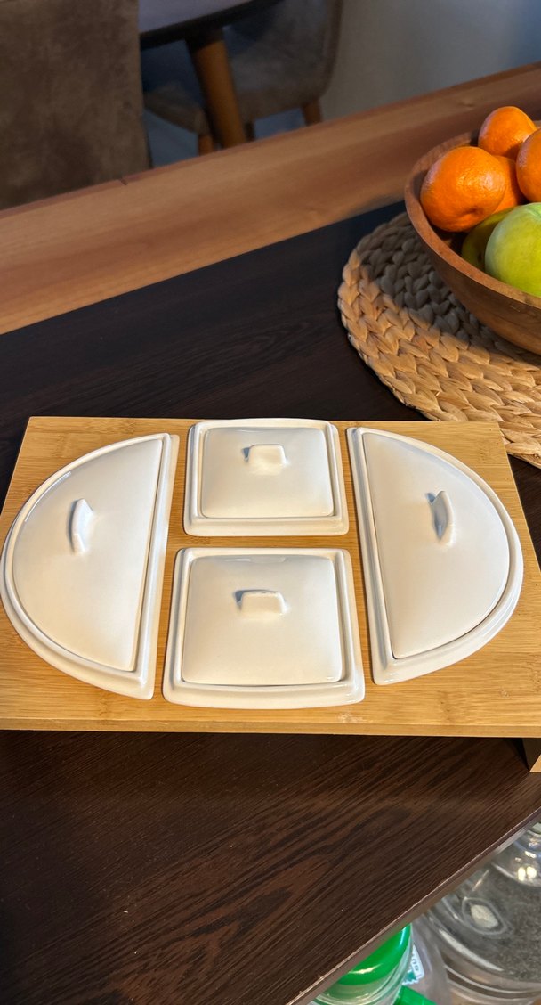 Beyaz kapaklı, çok bölmeli servis kabı, ahşap tepsi üzerinde düzenli sunum için uygundur. ️