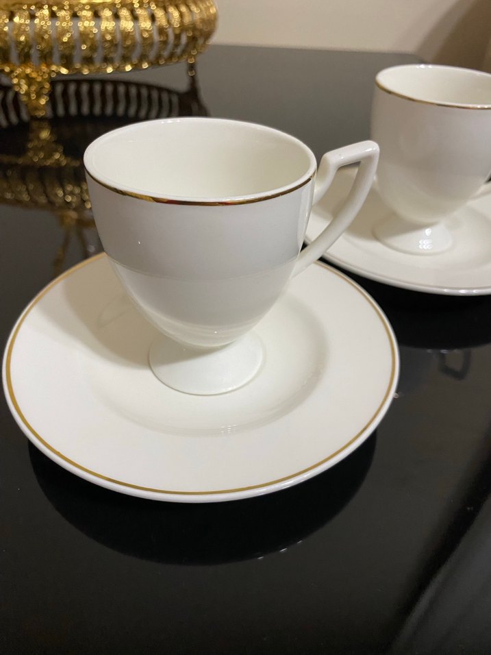 Beyaz parlak fincanlar, ince altın kenar detayına sahip ve uyumlu tabaklarla tamamlanmıştır. Zarif kulp tasarımı ile sıcak içecekler için uygundur. ☕ 2 Li olarak satıştadır dolabımda yer olmadığı için satıyorum hiçbir kusuru yoktur