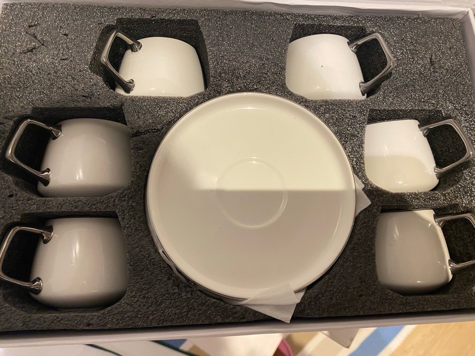 Beyaz seramik tabaklar ve gri saplı fincanlardan oluşan, desensiz sade bir tasarıma sahip set. İçecek ve atıştırmalıklar için uygundur. ☕ hediye geldi hiç kullanılmadı