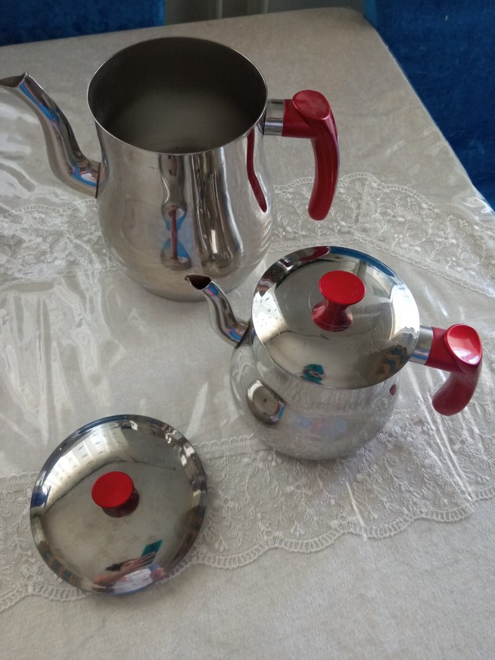 Canlı kırmızı saplara sahip, parlak paslanmaz çelikten yapılmış çaydanlık seti. ☕ sapları değişildi çok kullanılmadı akıtma yada başka sorunu yok büyük boy