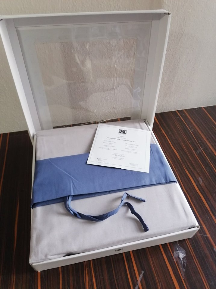 Karaca sıfır çift kişilik Gri ve mavi tonlarda baskılı nevresim ve çarşaf seti, kutusunda düzenli şekilde paketlenmiş. Bağlama ipi bulunur. ️
