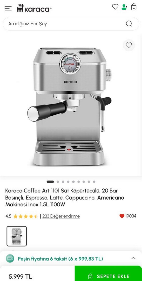 Ürün sadece 2 kez test amaçlı çalıştı , mükemmel ve profesyonel bir cihaz . kötü yorum bulamazsiniz , fakat daha buyuk bir urun kullandigimizdan fazlalik olarak uygun fiyata satilik. Karaca Coffee Art 1101, 1.5L kapasite ve 1100W güç ile gri espresso makinesi. 20 bar basınç ve süt köpürtücü özellikleriyle espresso, latte, cappuccino ve americano yapabilir. Paslanmaz çelik gövde ☕️.