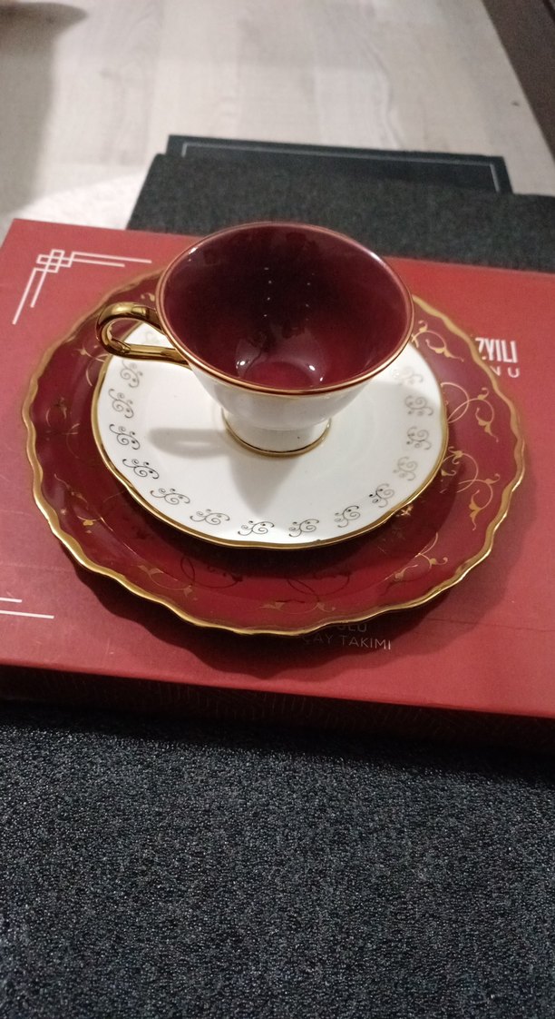 Karaca Cumhuriyet yüzyılı tulu çay takımı 2 fincan 2 fincan tabağı 2 tatlı tabağı Bordo renkli kahve fincanı takımı, altın detaylara sahip. Fincan, tabak ve küçük tabaktan oluşur. ☕