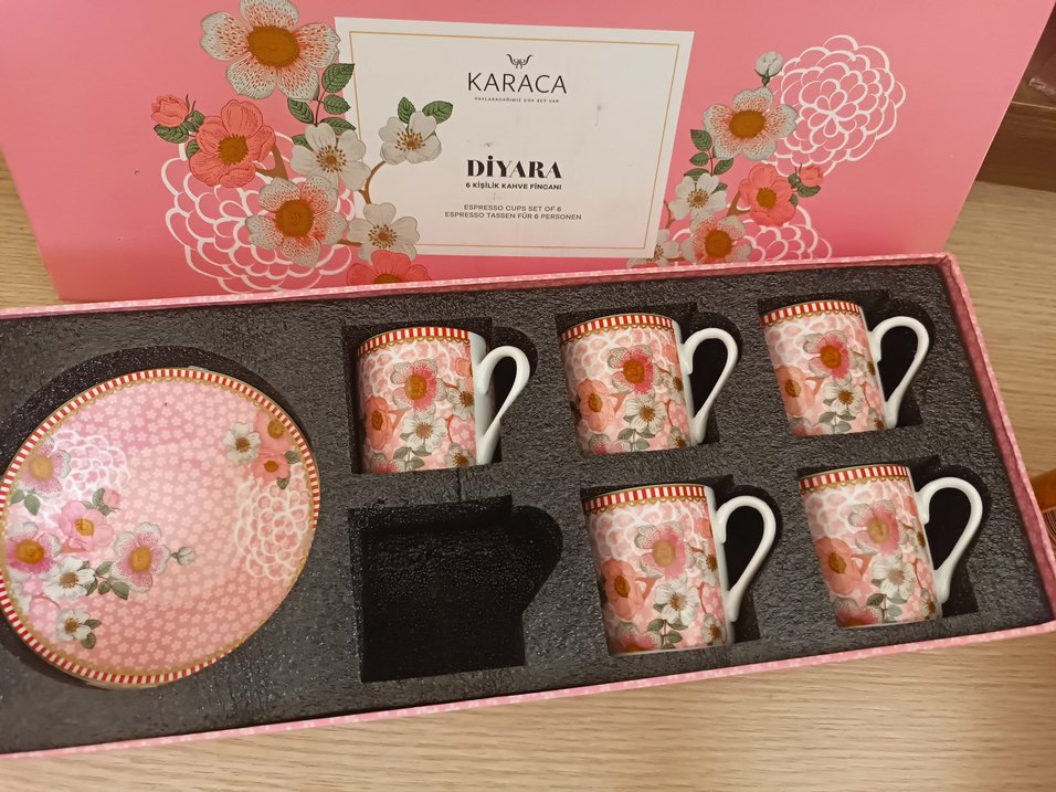 Karaca Diyara kahve fincanı seti, koyu pembe tonlarında çiçek desenli 6 espresso fincanı içerir. Her fincan beyaz kulpludur ve detaylı çiçek tasarımına sahiptir. ☕ 5 adet hiç kullanılmadı