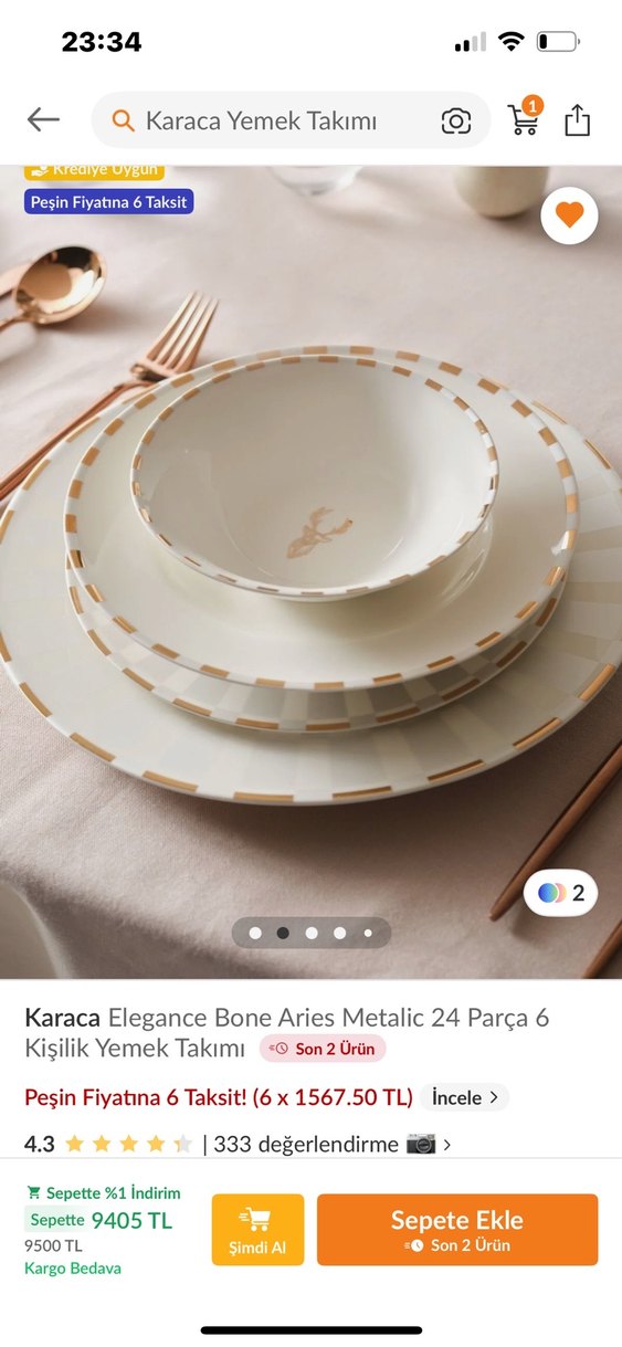 Karaca Elegance Bone Aries metalik detaylı, 6 kişilik 24 parçadan oluşan yemek takımıdır. Açık beyaz tonu sofranıza zarafet katar. ️ 2 aylık evliyim farklı bir takım hediye geldiği için bunu satıyorum yepyeni pazarlık payı vardır