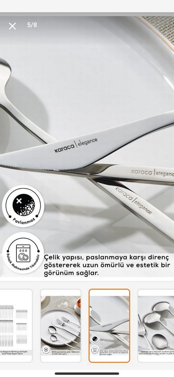 Karaca Elegance bıçak, paslanmaya dirençli çelik yapısıyla uzun ömürlü ve estetik bir görünüm sunar. Bulaşık makinesinde yıkanabilir. 6 adet var sıfır kullanılmamış çok ağır şık alan pişman olmaz