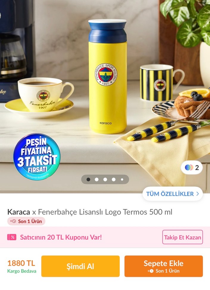 500 ml kapasiteli, sarı renkli ve Fenerbahçe lisanslı logolu Karaca termos. İçeceklerinizi 12-15 saat sıcak ve soğuk muhafaza edebilir 24 saat buzlu muhafaza edebilir. Akıtma sızdırma yapmaz orijinal üründür sıfırdır hiç kullanılmamıştır