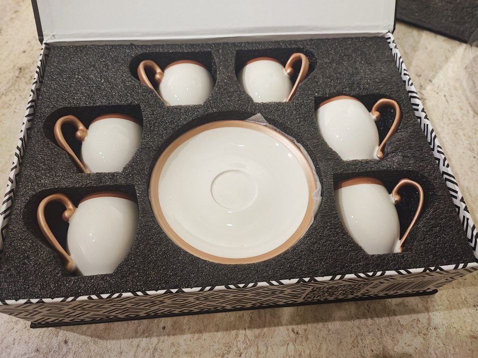 ihtiyaç fazlası olduğu için satıyorum Bakır ve kenarlı beyaz fincanlar ile uyumlu tabaklardan oluşan fincan takımı. ☕